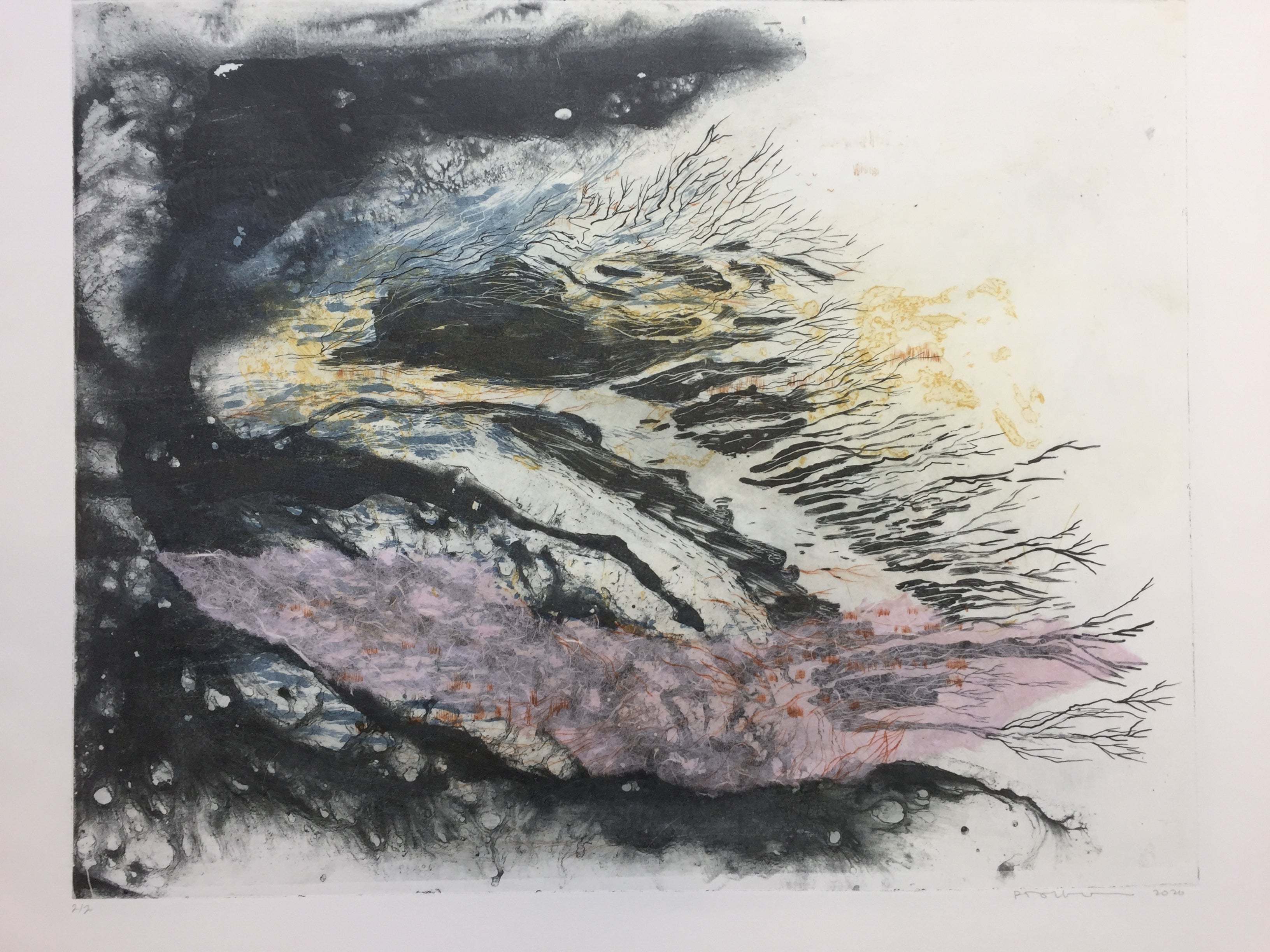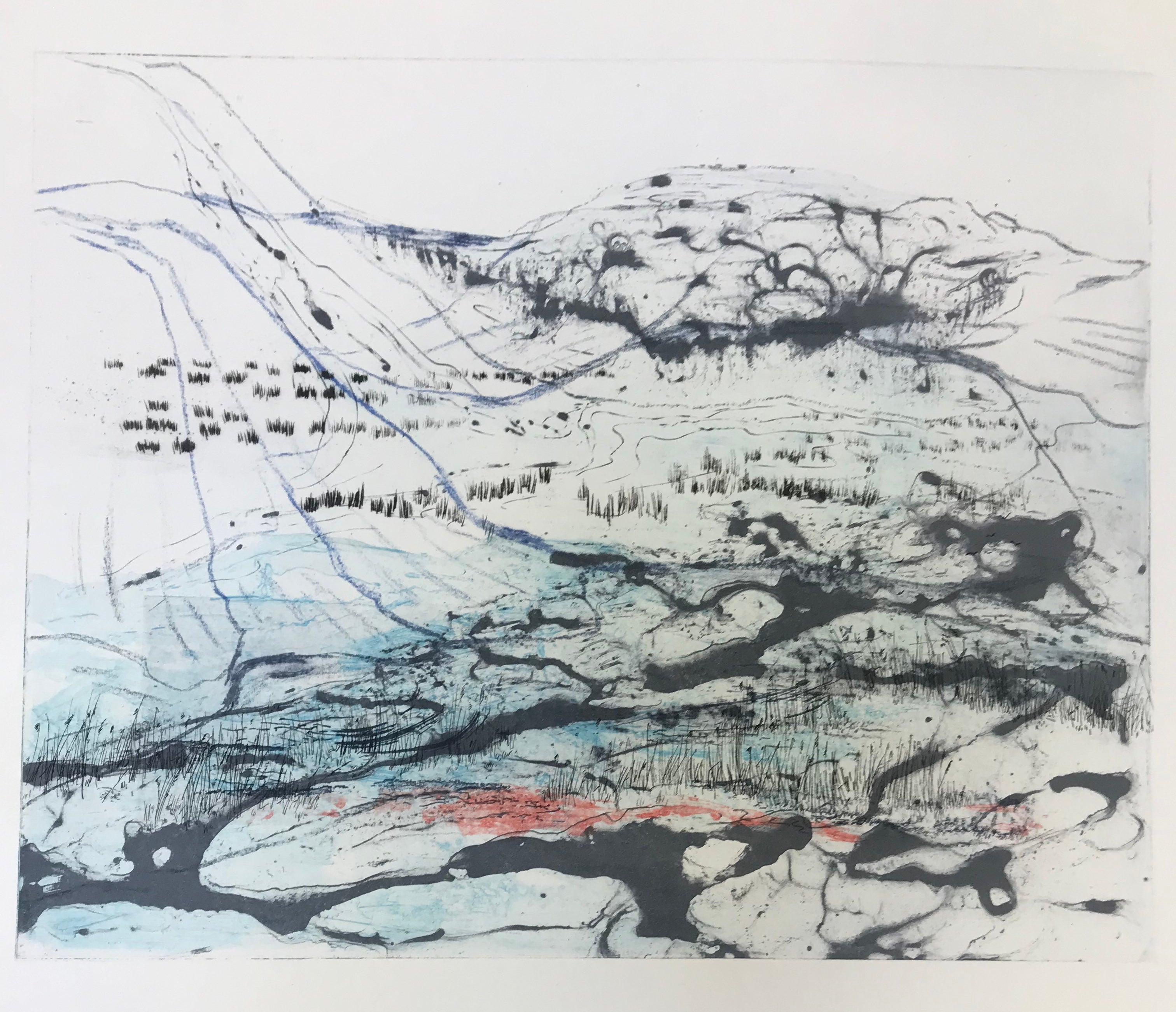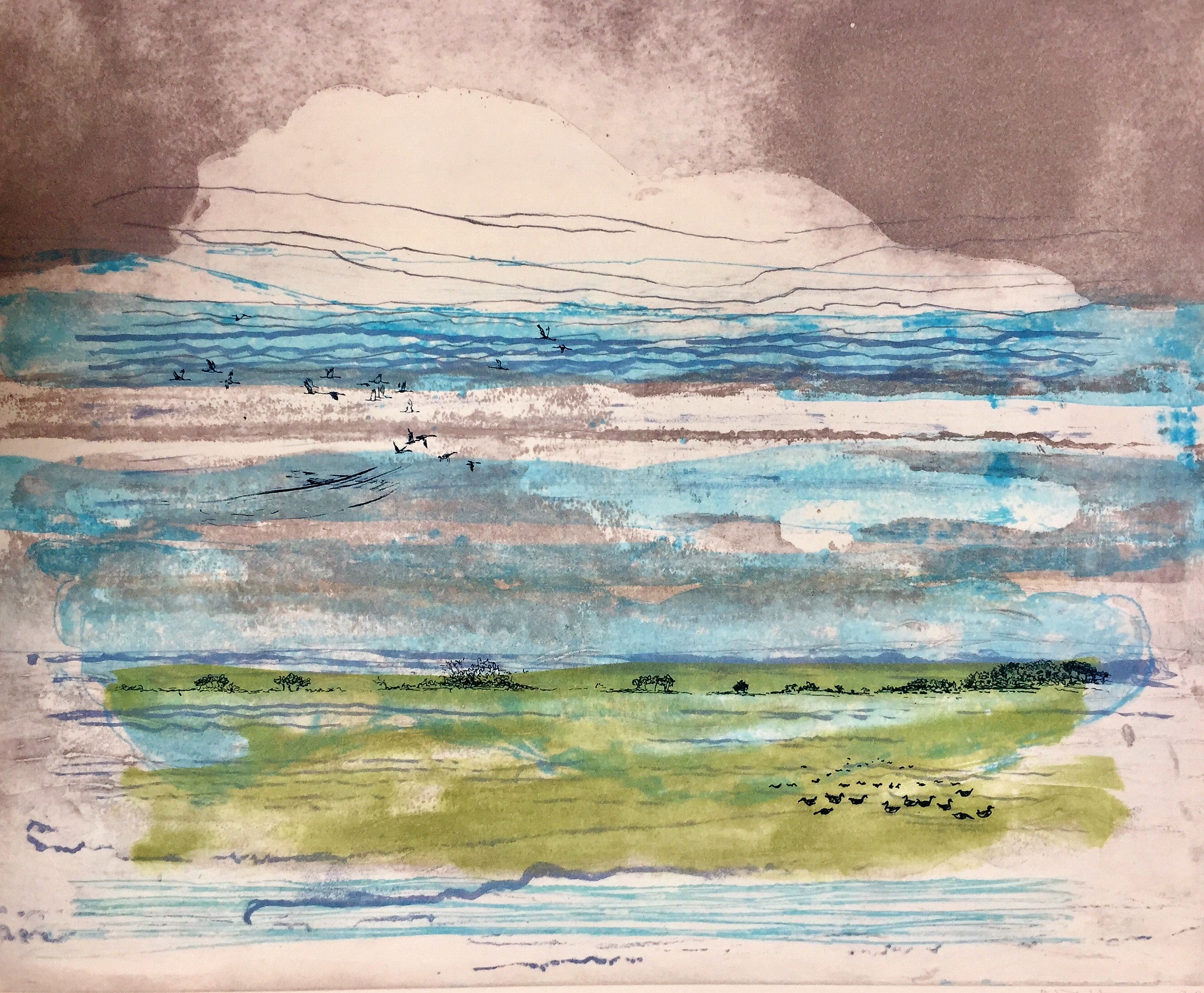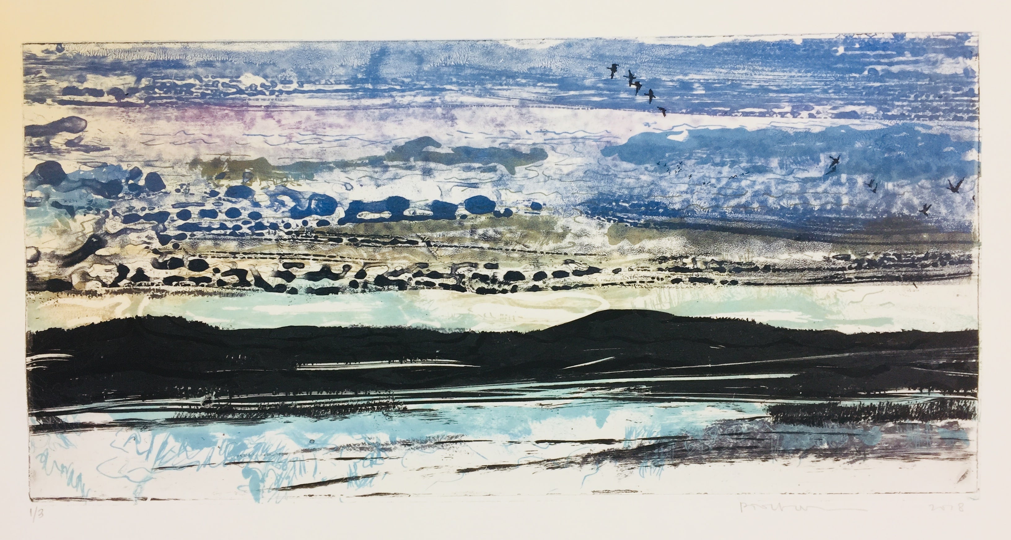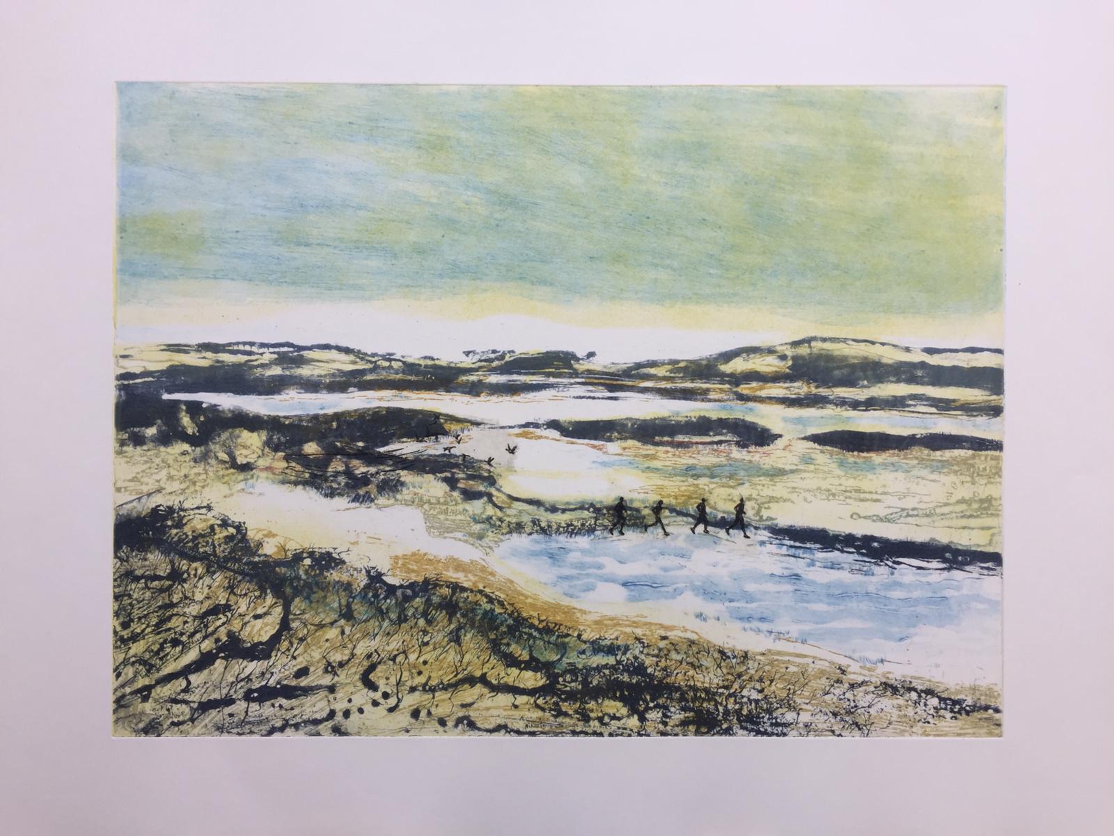 The alternation of creative thinking, searching, weighing and looking at the traditional aspect of etching: I find (besides drawing) sanding, degreasing, biting and scratching relaxing and inspiring. Printing is always exciting, because rarely is the result as you have ‘printed’ it in your mind. For me that’s the challenge; searching and looking over and over again. The image requires attention and the dialogue with my print starts. The landscape gives the opportunity to work poetically and abstract. As well as it gives enormous freedom to experiment with techniques. Color over color in combination with area and line. I walk through my landscapes. No human being present, the elements in charge. Nature is breathtaking beautiful to terrifyingly overwhelming. Very vulnerably and yet extremely strong. These and everything in between fascinate. My works often do not have separate titles; they are part of a series with a theme. The theme offers me focus while creating and space to explore. Animals also feature my work. Sometimes hidden and then a little on the foreground. Although they do not play a leading role in my work, they are inextricably linked to it. Birds are especially important, they suggest movement, sound and most important: Freedom.