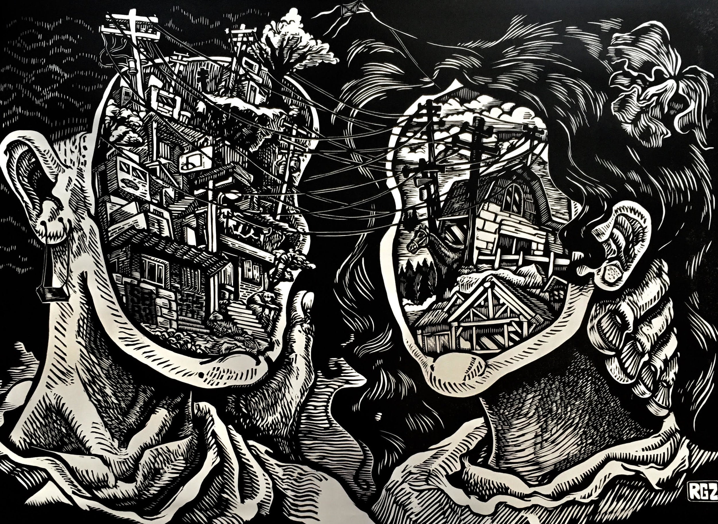 His desire to promote the printmaking practice has guided him to develop projects such as “First Vandal Steam Roller Project” and “The Ink Rally,” projects where large carved pieces were printed on fabric using asphalt roller with the help of many printmaking enthusiasts. In addition, RGZ has been collaborating with local non-profits to develop the Spokane Print Fest. This venue celebrates all things print-related where local universities, students, artists, instructors, and professors offered live printing demos and exhibited artwork in the pursuit of promoting accessible printmaking to the rest of the community. Such projects have worked as communal developers and forces of integration between the academic, artistic, and larger communities in the Northwest. “Spokane is becoming a Print Town”