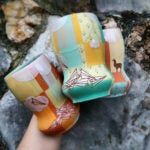 - wheel-thrown vessels decorated with vinyl and paper resists, hand painted layers of speedball underglaze, incising and slip trailing