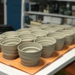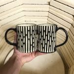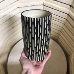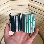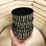 My primary style of working is in batches of 20-30 pieces at a time that look similar, but not exact from one to another. I’ve enjoyed adding some new techniques into my toolbelt over the past year or so while adding a line of sgraffito work to my product line. Where the production work relies on the glazing techniques to stand out, the sgraffito pieces rely on efforts made during the throwing & leatherhard stage to produce the end result. Glazing is easier on these pieces, but they require me to slow down and focus on each piece. Since these forms take longer to produce, I have to be more selective which ones I’d like to add to this product line as it grows.