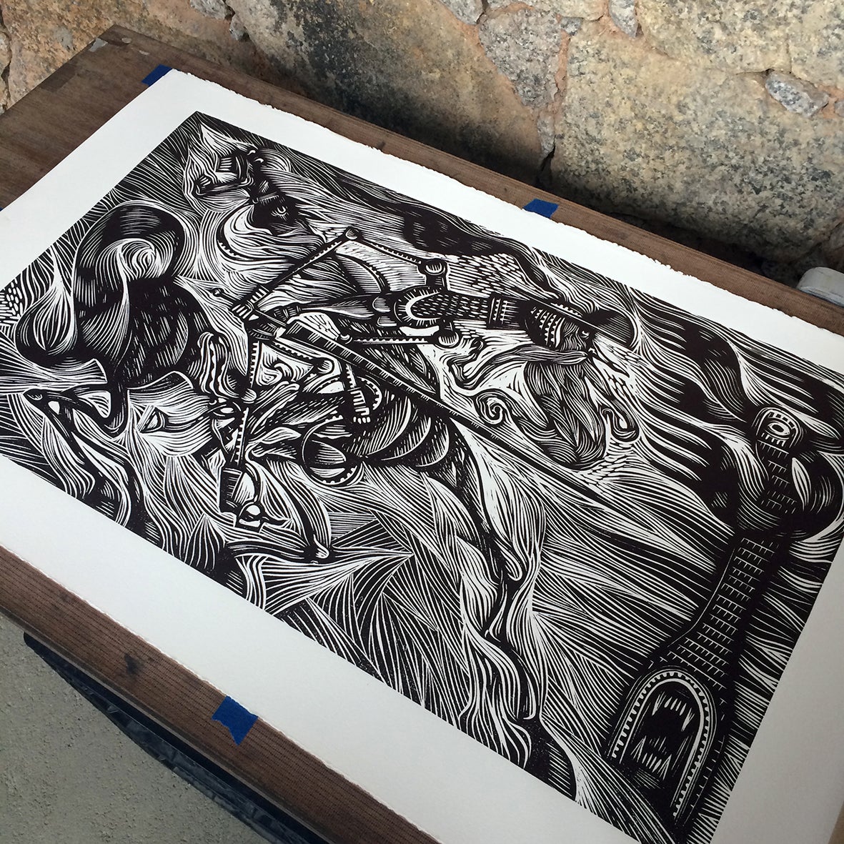 Samuel Casal was born in Caxias do Sul, Brazil, in 1974. He has been working as a graphic artist since 1990. Winner of numerous awards in Brazil, such as Jabuti, the main prize in Brazilian literature, as well as the Honourable Mention at the Brazilian Biennial of Graphic Design. His artworks illustrate books and magazines worldwide. In 2003, Casal started working with printmaking. His creations have been exhibited in several countries including France, Germany, Spain, Russia, Norway, Argentina and Bolivia. Casal currently dedicates himself to research and painting on ceramics, mainly with the sgrafitto technique. He enjoys exploring different media though maintaining an aesthetic coherence. Therefore, the artist developed a unique way of creating his pieces based on acquired knowledge through the experimentation of materials, tools, and techniques of traditional engraving.