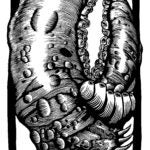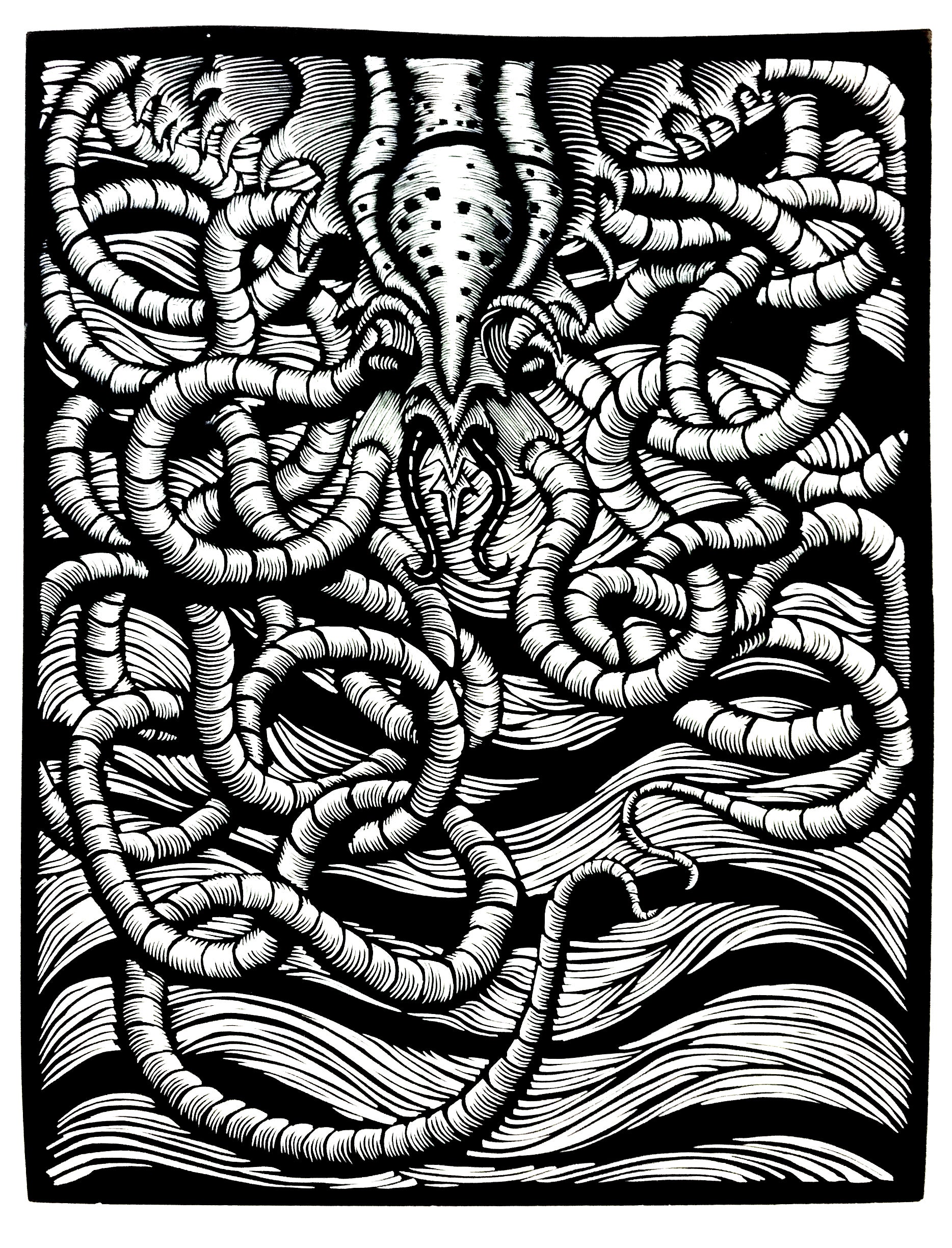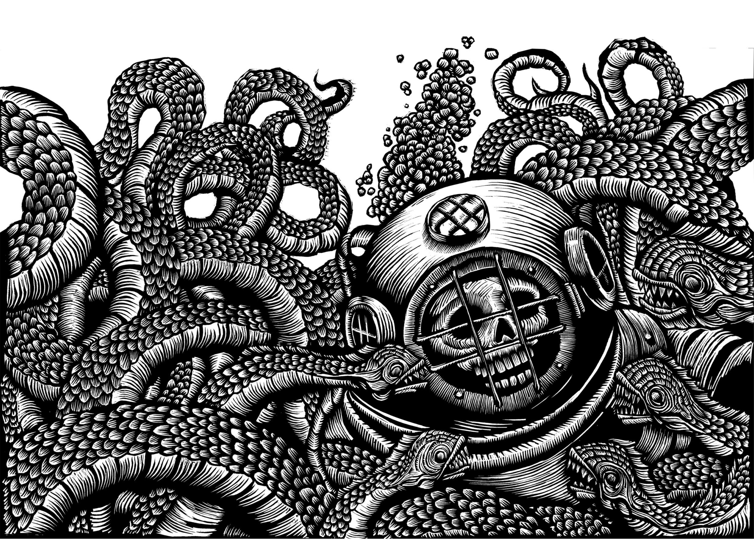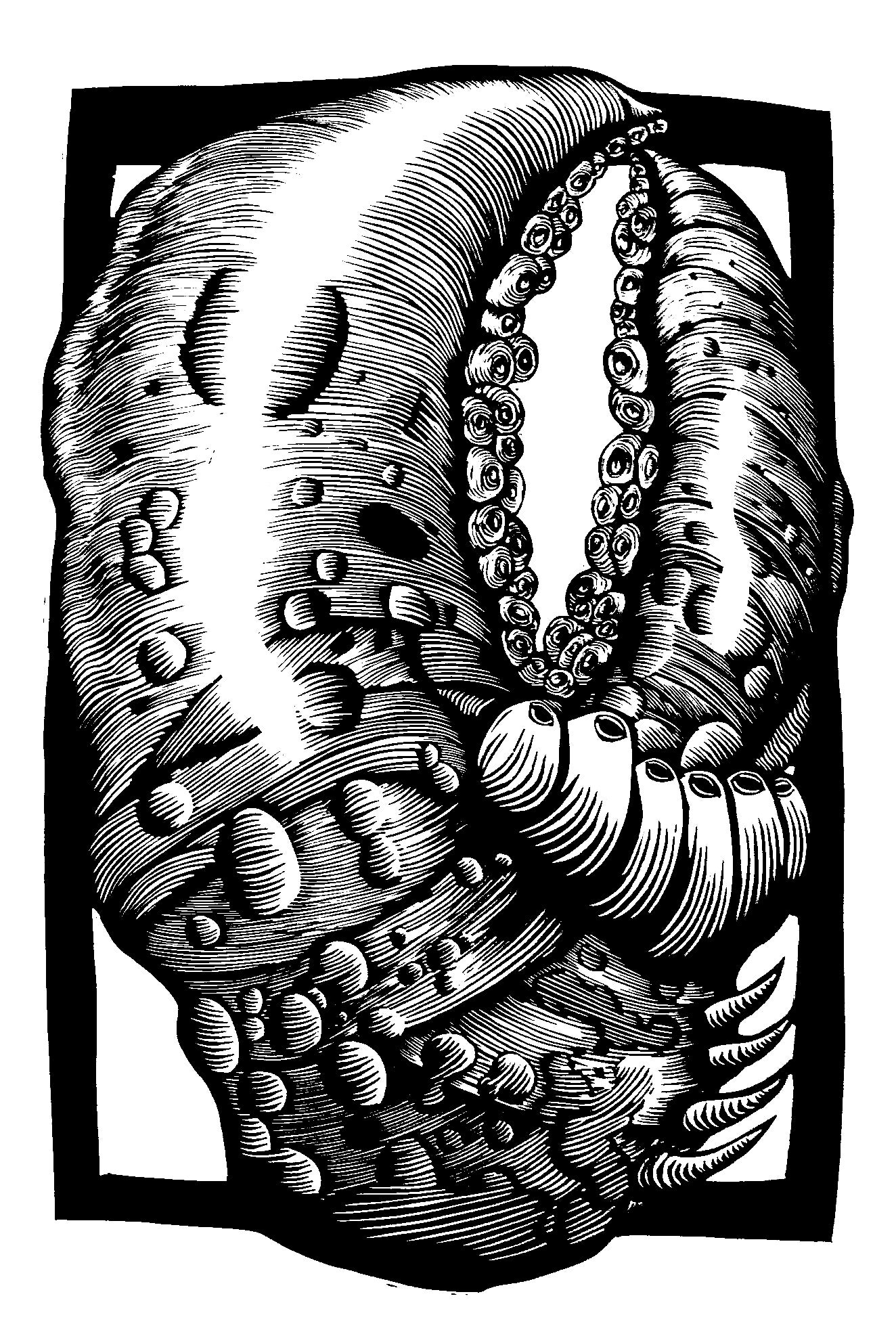 My work addresses the universal themes of fear, regret and longing. In my prints these feelings are made manifest with an obsessive network of wiry, anatomical lines, subtle and twisted. I find relief printing the perfect way to depict both our inner turmoil and the outer physicality of the human form at once. Sometimes this might appear on the surface of the skin, take the shape of an organic growth or painfully permanent subtraction.