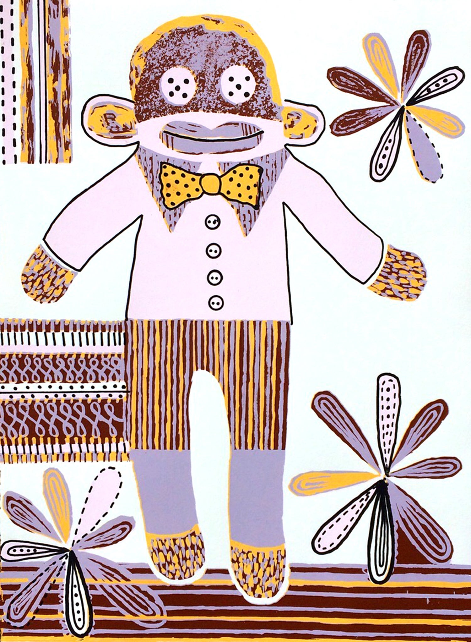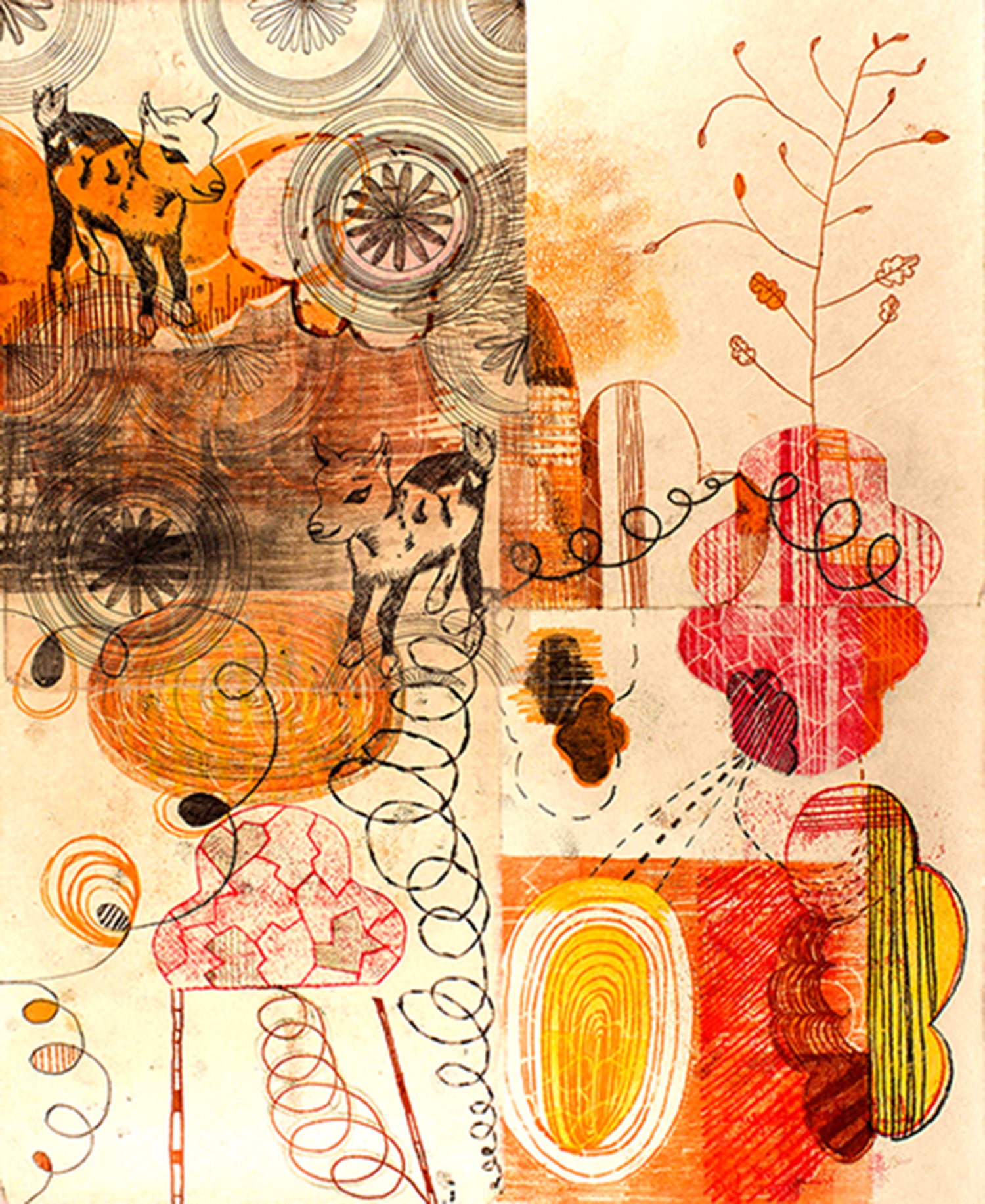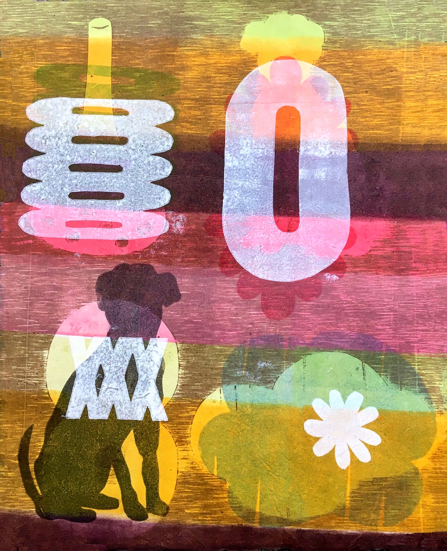 After completing her 17-minute short film, “My Mother Thought She Was Audrey Hepburn,” Sharon took a Monoprinting class and she was hooked, lined and sinkered. To make something so exciting in a day (using your hands!) was a THRILL, and she set off on a lifelong pursuit of all things printmaking. After graduating from the California College of the Arts with a B.F.A. in Printmaking, she became an Artist-in-Residence at the Kala Art Institute in Berkeley where she is still printing today. Sock Monkeys, the Numbers 8 & 17, Punctuation Marks, Clouds, Eye Charts, Constellations, Dogs, Cellular Structures and Plants of all Persuasions populate her prints with humor and whimsy. Nothing makes her happier than mixing Extender and Trans Base into inks, overlaying colors, building up textures, and cranking plates through the press.