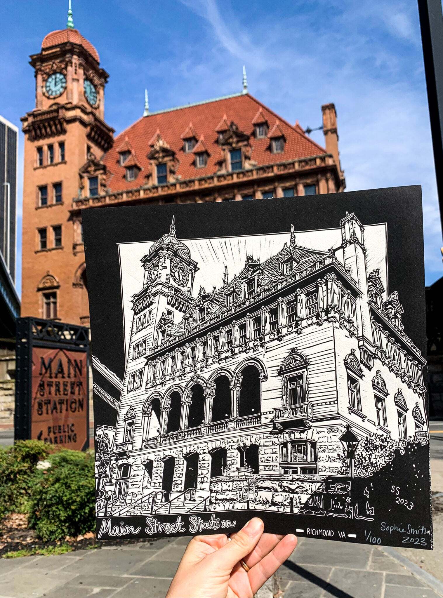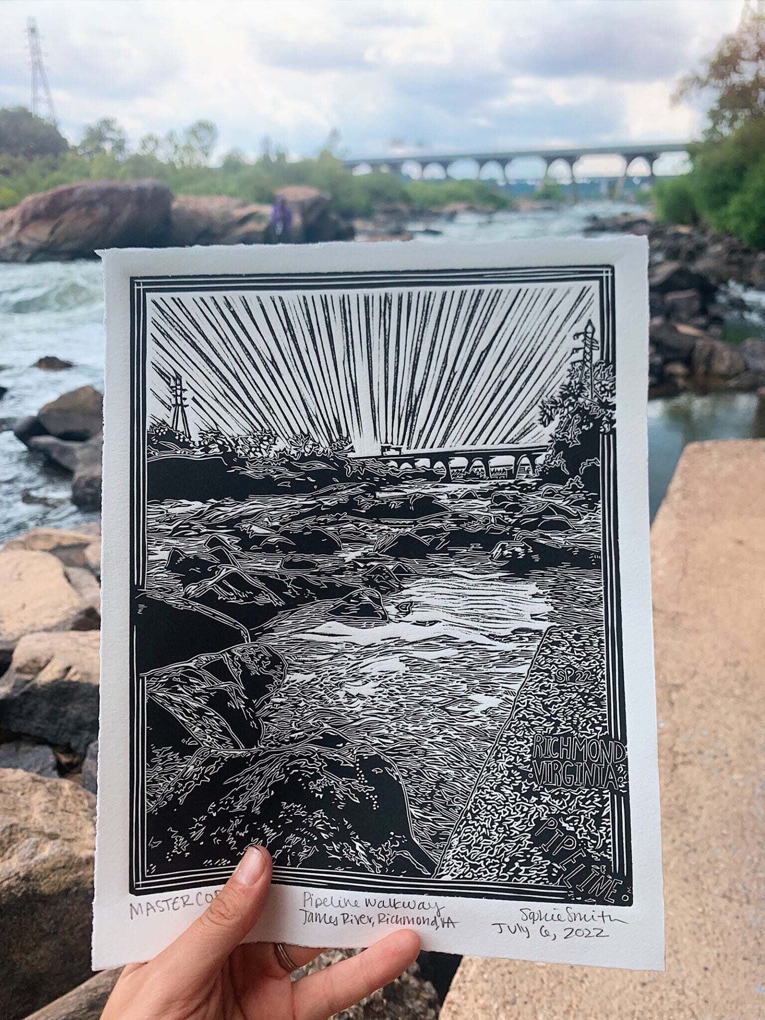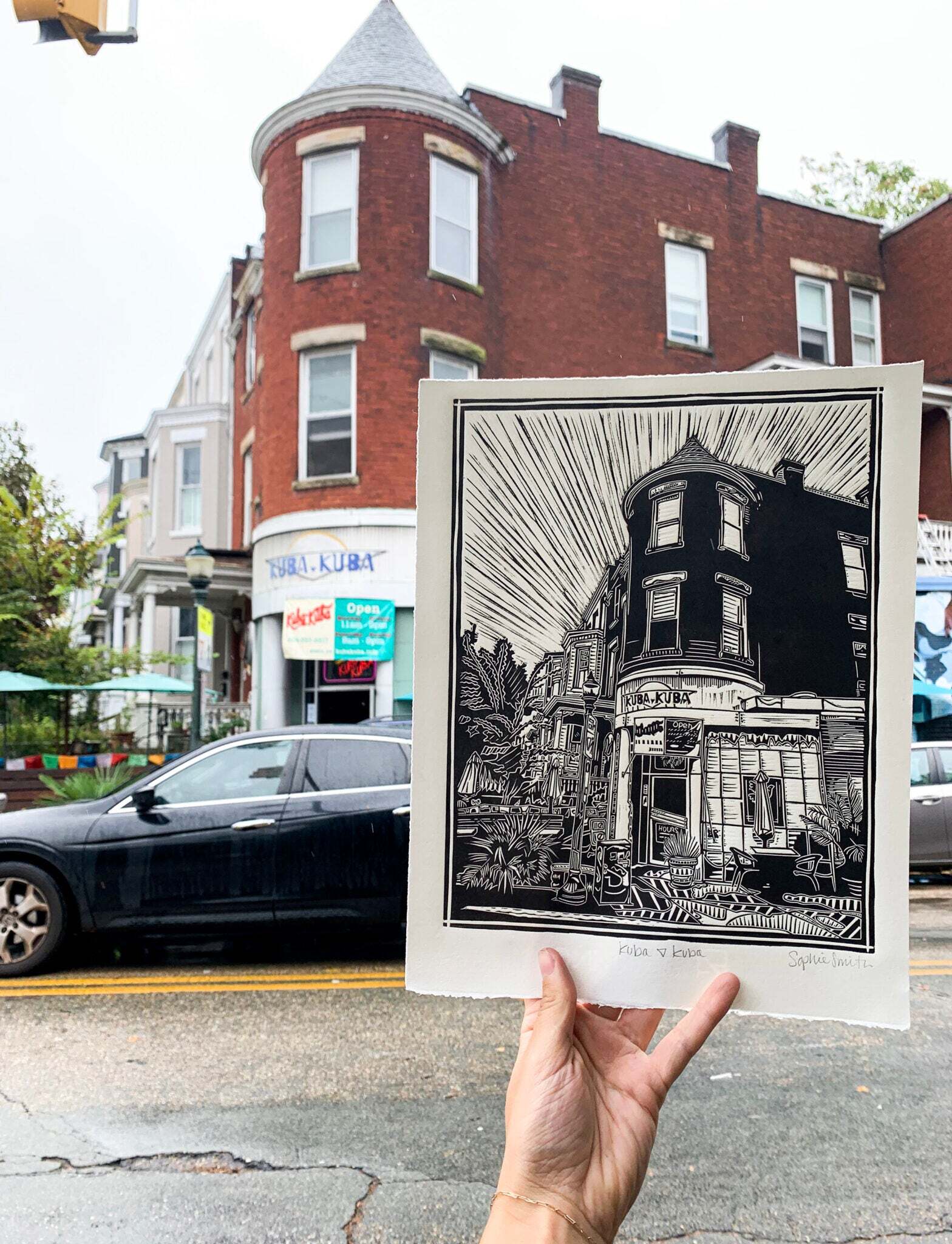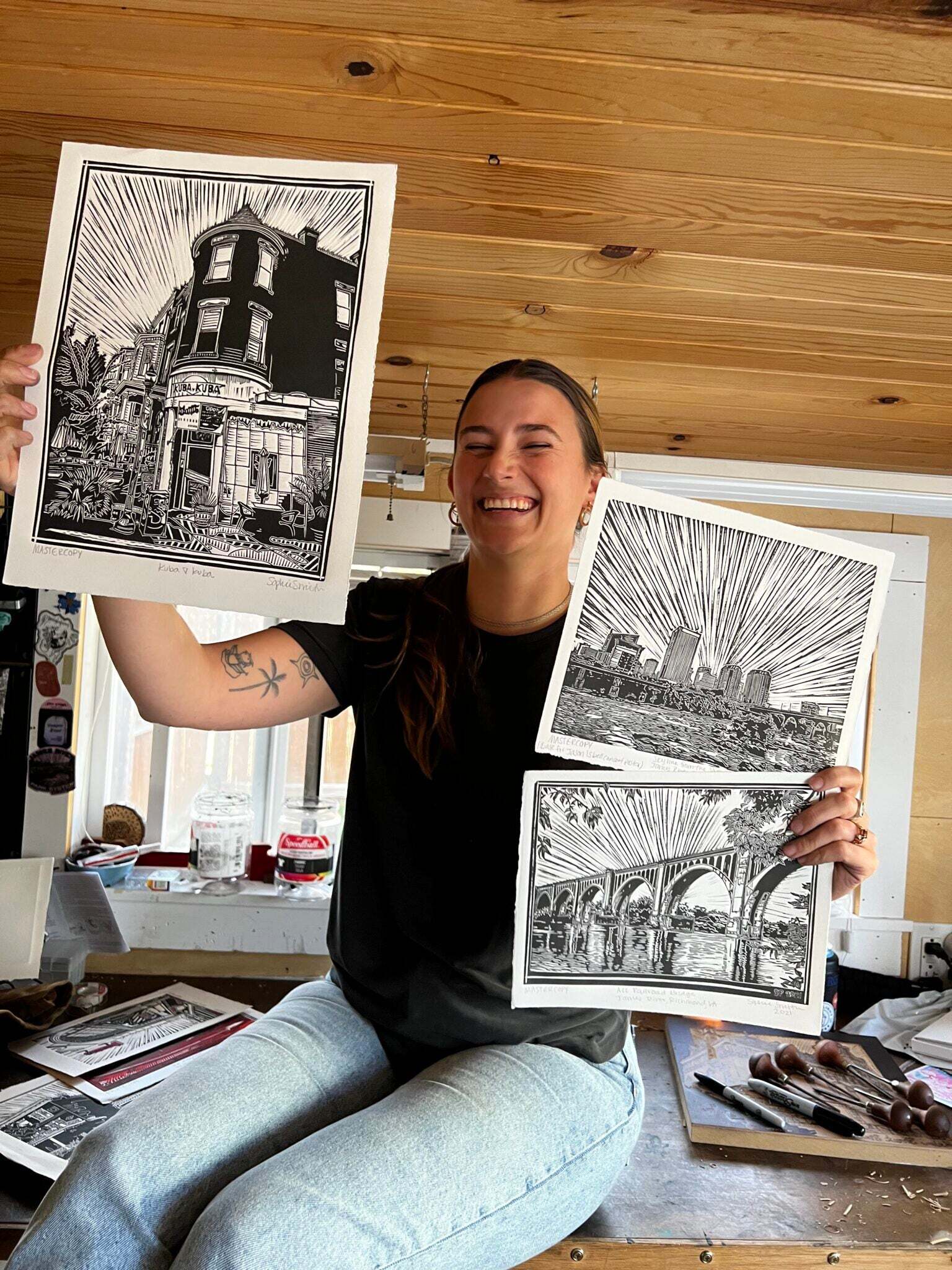 Sophie Sallade is a printmaker from Richmond, VA, USA that makes relief prints, screen prints, and apparel of her hometown, and beyond! She primarily works out of her tiny backyard studio with her shop dog, Babs! She likes to think of her architectural/nature themed prints as a love letter to the city she grew up in, and as an autobiography of her favorite places she’s visited and frequented over the years.