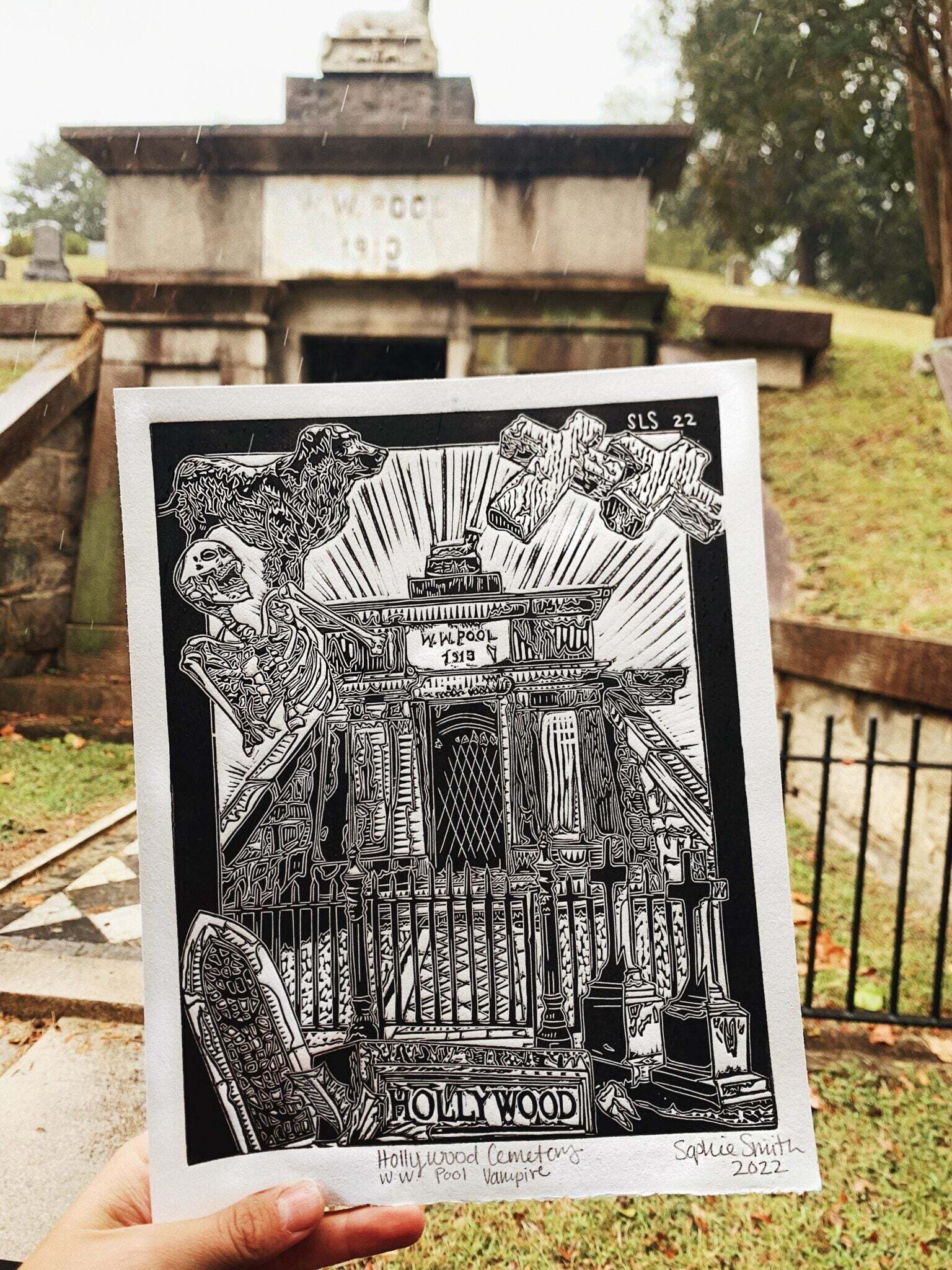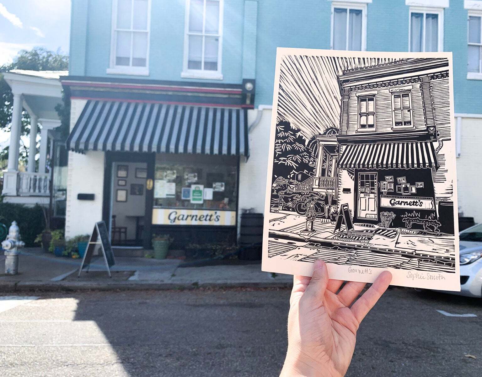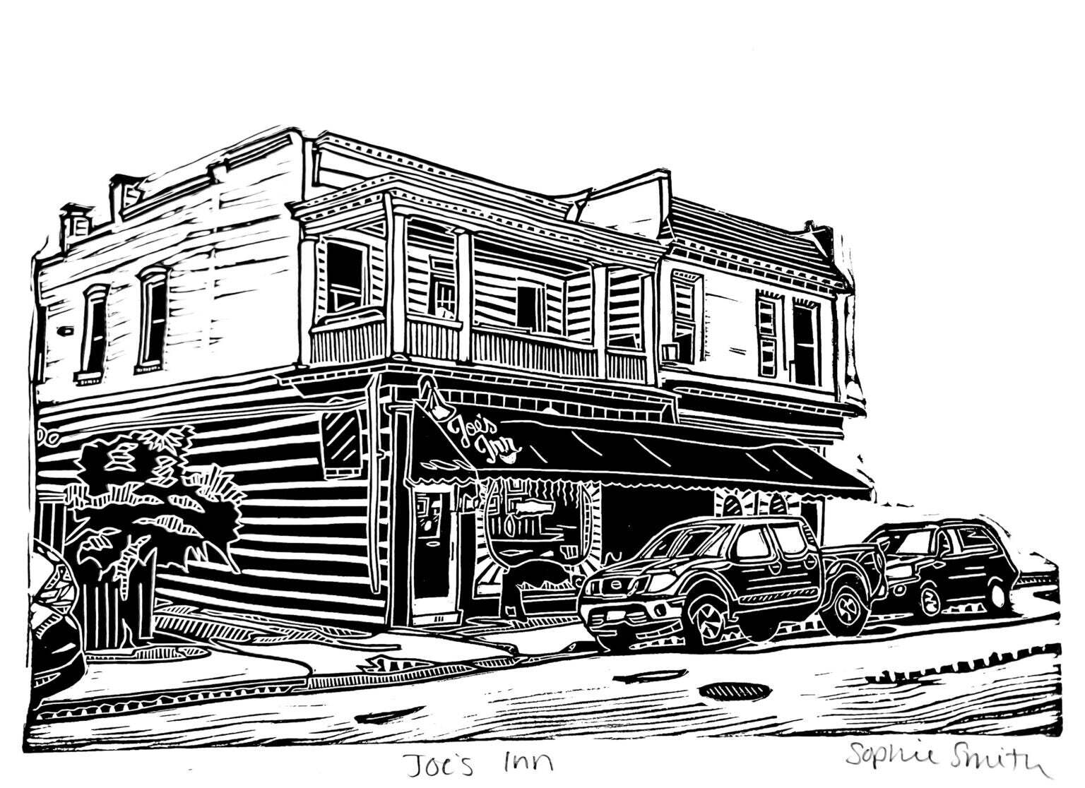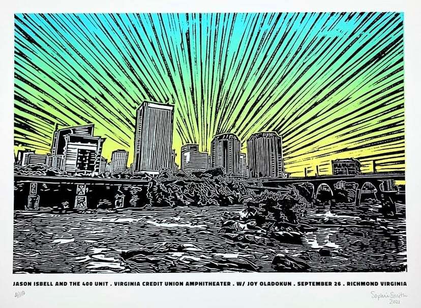 Sophie Sallade is a printmaker from Richmond, VA, USA that makes relief prints, screen prints, and apparel of her hometown, and beyond! She primarily works out of her tiny backyard studio with her shop dog, Babs! She likes to think of her architectural/nature themed prints as a love letter to the city she grew up in, and as an autobiography of her favorite places she’s visited and frequented over the years.