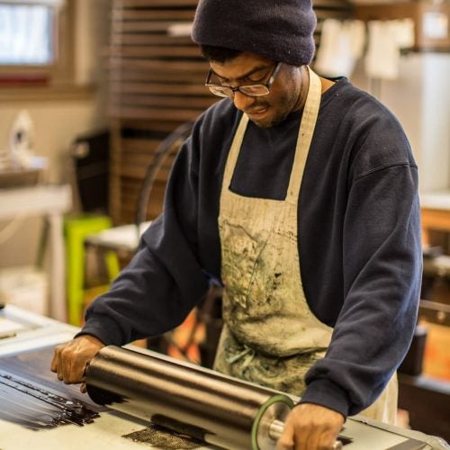 Moving to Portland, Oregon on a whim in 2008 he began to work in linocut at various fine arts printmaking open studios and also building silkscreen printmaking frames to print from home. Stephen returned to Lexington Kentucky in 2010 and then began to use the BPC studio and as well as renting space at Awesome inc. and between 2011-2013 he created rain barrels for the Bluegrass Greensource winning every year the rain barrel artist award. In 2013 he created a bourbon barrel with LexArts public arts project and in 2014 he decided to focus primarily in fine arts printmaking with linocut and silkscreen. He then showed his prints in art fairs, markets, and exhibitions regularly in the central Kentucky area and nationally. In 2015, he became the president of the Bluegrass Printmakers’ Cooperative and in 2016 he oversaw the move from the BPC from LexArts to Parks and Recreation and accepted the position of liaison between the BPC and Parks and Rec. He now hosts a podcast featuring printmaking interviews with artists and now lives and works in St. Louis Missouri and rents monthly space as a member of the Evil Prints member.