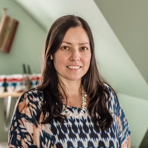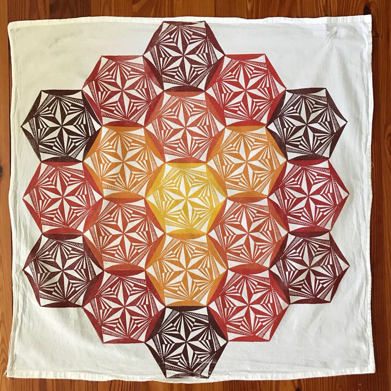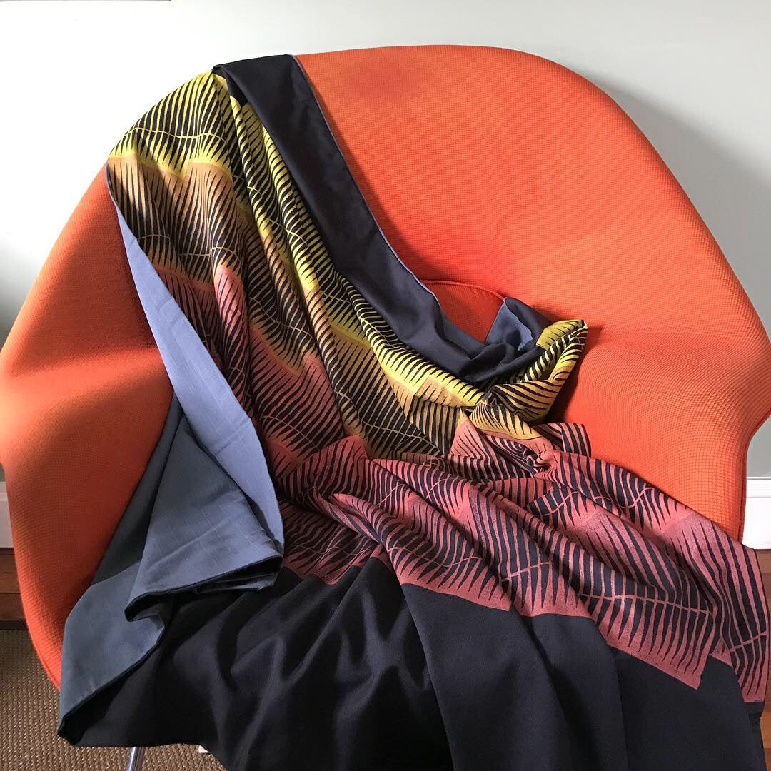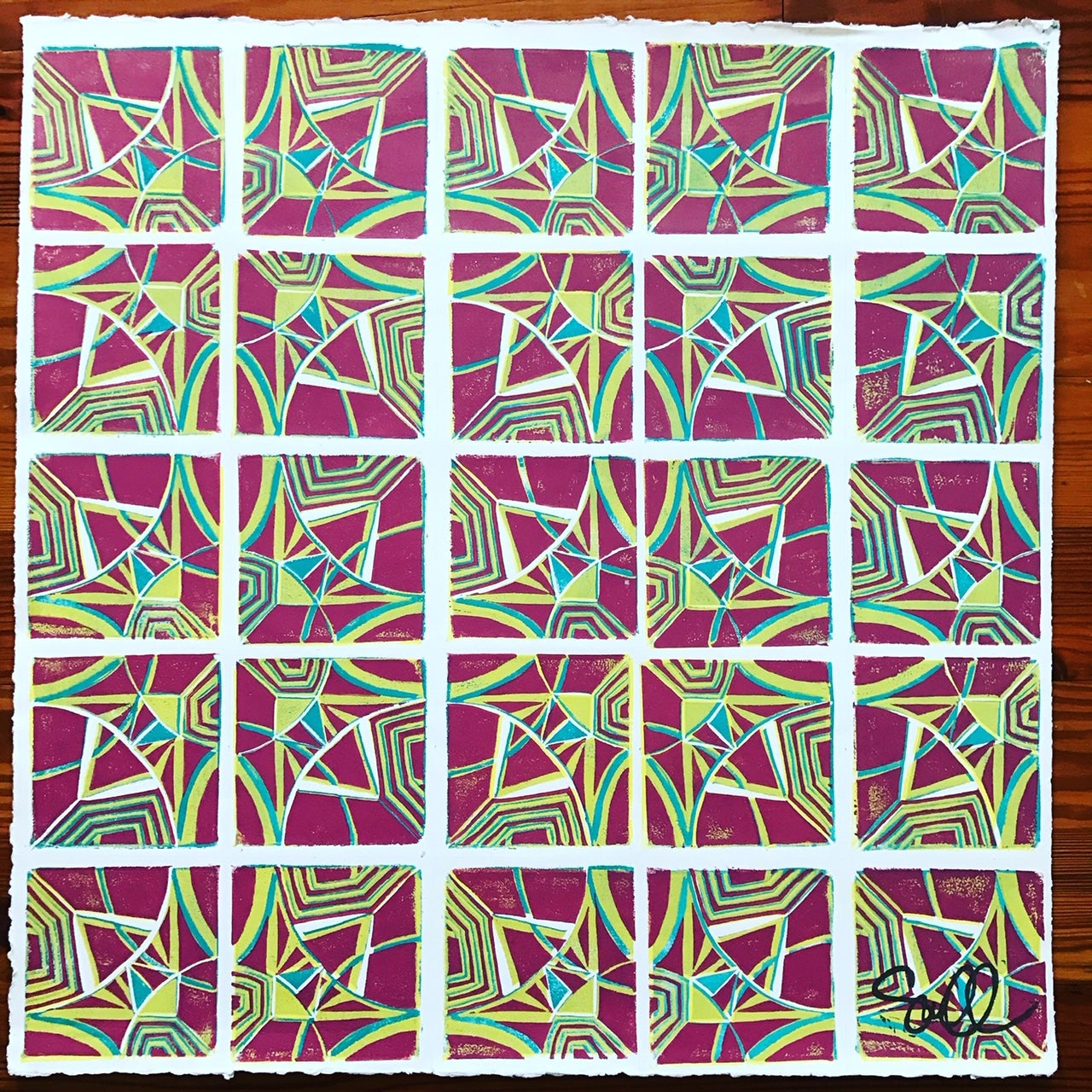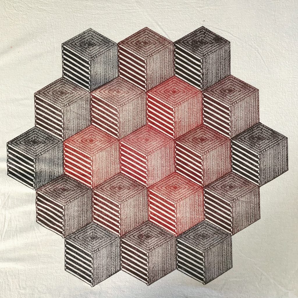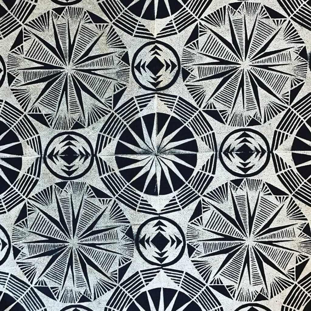 Susana has an innately exploratory approach to all mediums and enjoys figuring things out on her own. While her background seems diverse, upon further inspection there are similarities between her preferred mediums. Glass, wood, and printmaking are all very physical, require precision, and involve patterns. Color is also a huge element in both glass and printmaking. Although she has a BFA, Susana’s work has always represented a balance between art and craft, as she is drawn to functional art. Upon completing her own studies, McDonnell taught art to junior high and high school students for seven years. It was while teaching relief printing to her students that she began to study it on her own. It was during this time that she developed her signature reduction grid course, which she has since adapted for adults. Eventually after becoming a mom, McDonnell decided to concentrate on lino printing as it was an art form that she could easily work on from her home studio. Susana is inspired by the potential of materials, particularly fabric. She lets the fabric dictate what type of item she is going to make and what style pattern, rather than beginning a project with a set idea of what she wants to make and what the design will be. She finds satisfaction and joy in “peeling back the inky lino and seeing it transform a formerly plain surface into something completely different and new.” Her strong foundation in drawing provides a solid basis for her printmaking and her European travels inspire her geometric and shape-driven designs. She is a natural at creating patterns and has taught herself to use circle tracers, compasses, etc. She is also known for her use of dynamic colors (a connection to her previous work with glass). She creates modern, clean designs, which she prints on both wearable items and accessories.