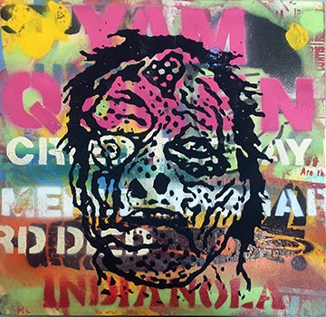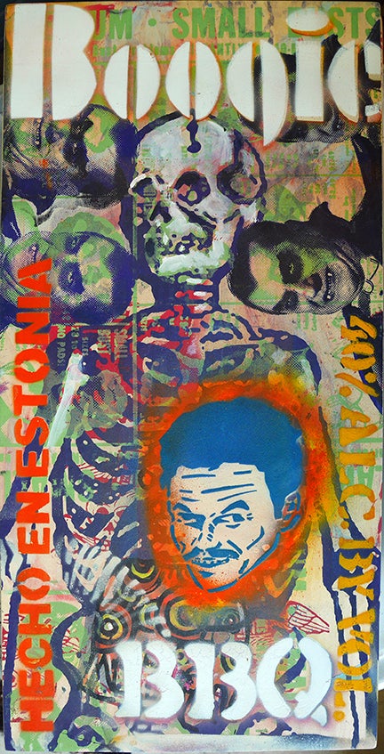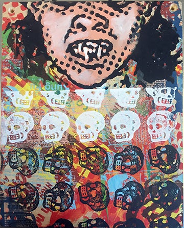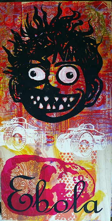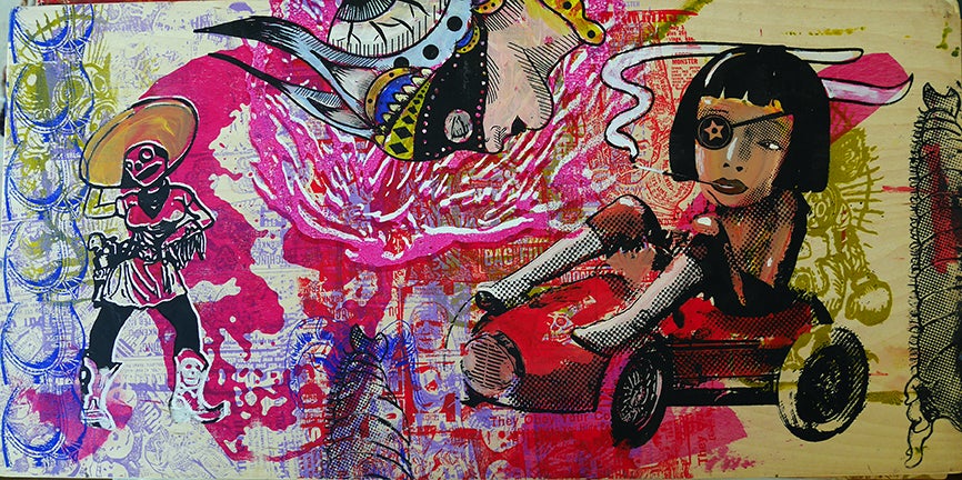 Los Hermanos Hancock particularly excel in woodcuts and silkscreen prints, or mixed-media variants of all. They also double-team on mixed-media prints, where genre and identity both blur. Of special note, they use exotic material such as mattress covers, plastic, metal flashing, little mermaid bed sheets, recycled materials or even a good piece of rag paper–whatever is handy to print on.