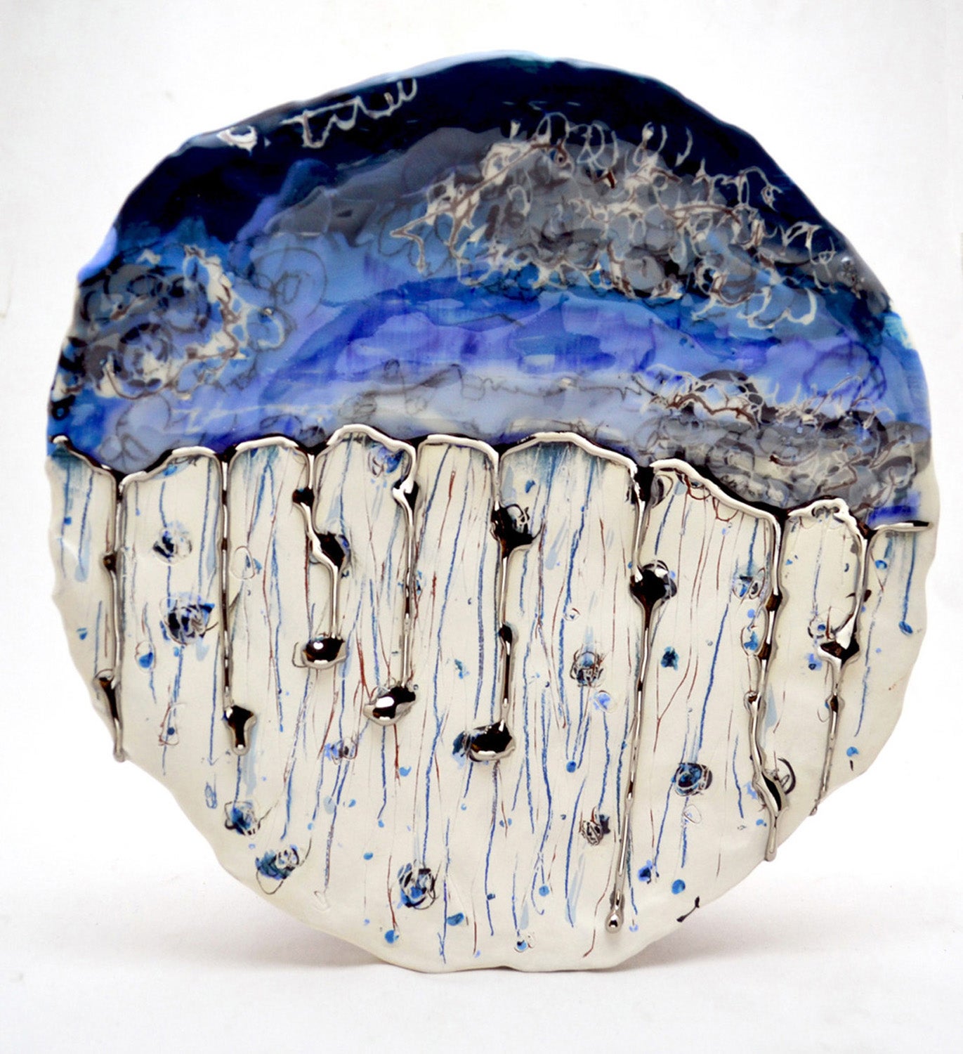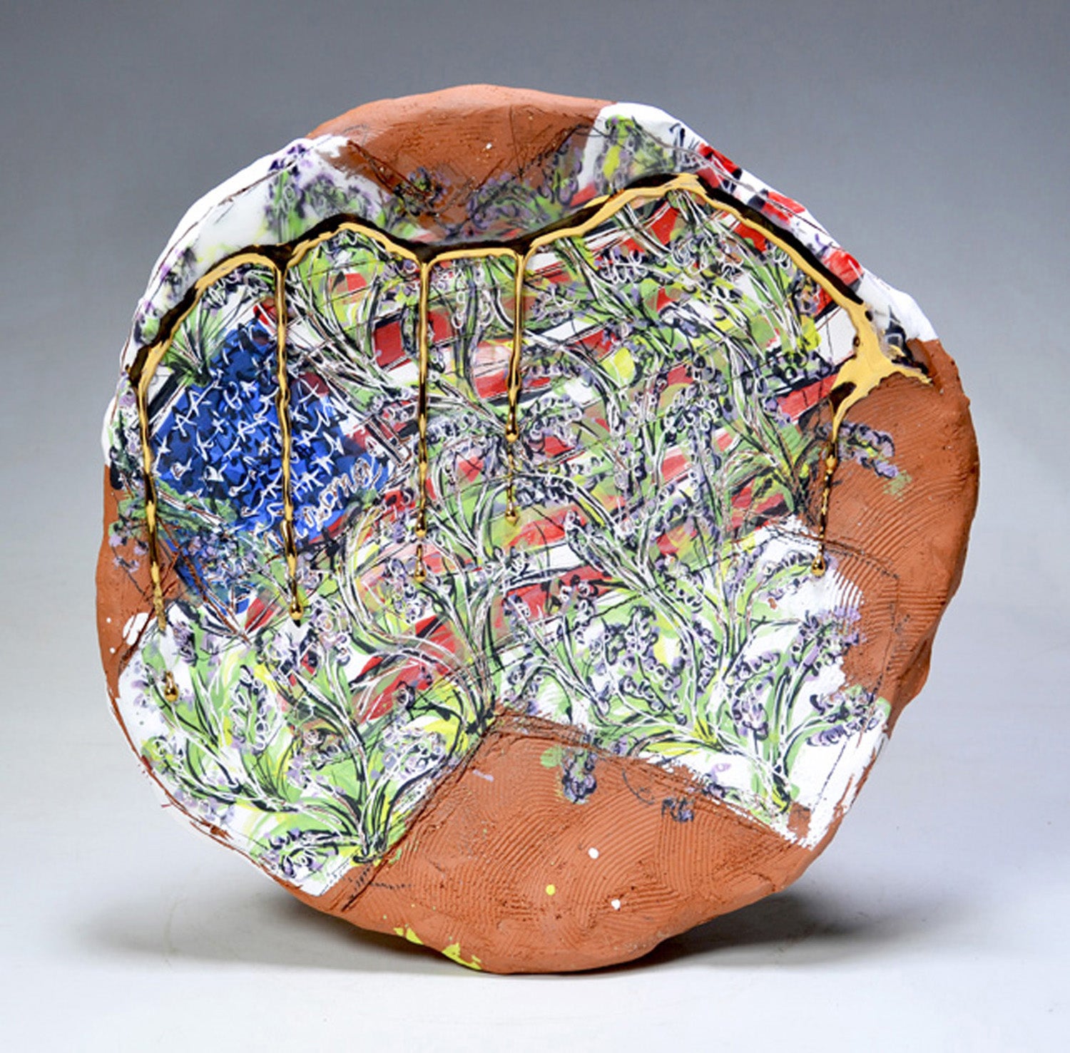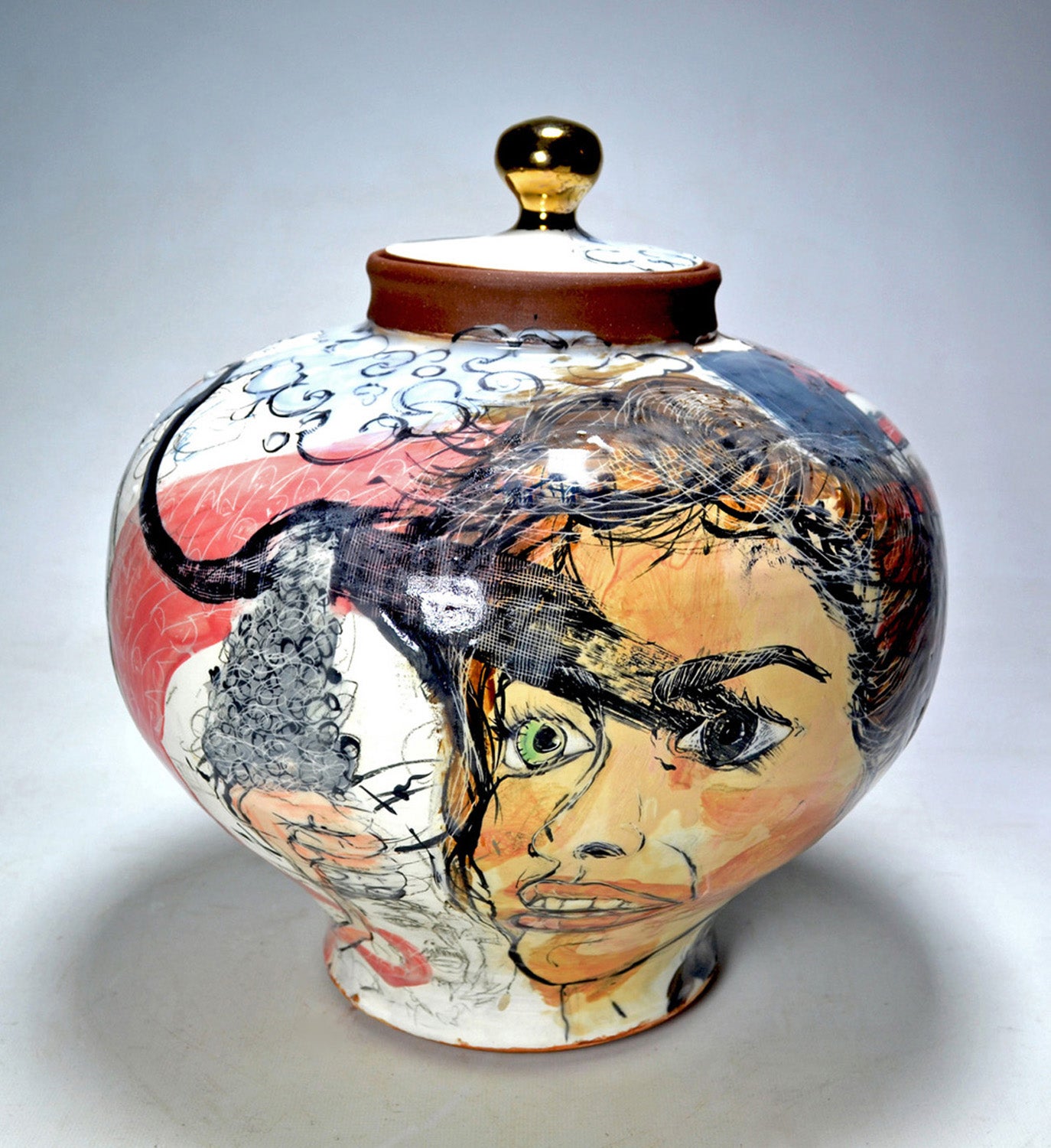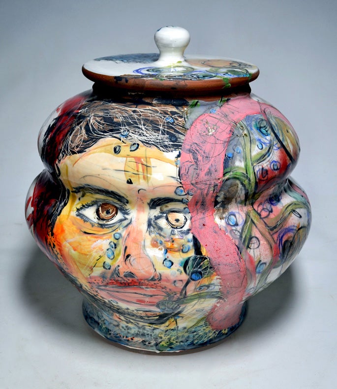 My work is always in transition. I am currently exploring the vessel and plate form - with gestural curves and lumps and formed through naïve or clumsy building methods. The surfaces are pocked with expressive underglaze paintings, drawings, scratches, and other marks. My forms often change from functional to sculptural and the drawings flow from representational to abstract. The vessel and painting are the only constants through my disjointed working methods, tangled subject matter, and my inability to commit to one expressive format, be it utility or autonomy. I use pottery and the vessel as a universal entry point to the ideas represented on the surfaces of my work. I choose to work with the vessel and in a craft material (clay) for its history and material iconography (baggage). The surface paintings can be simple narratives that are derived from my everyday life, or gestural and intuitive expressions of emotion and material. The combination of naive illustrations, expressive mark making, gold and silver luster, and gooey glaze on the pots are used to make them trite, cliché or obnoxious. Some surfaces are cute and some sinister, some can be taken at face value and some are subversive. I want this representation of daily life and my experience to be complete with all of its fashions, failures, fractures, and fleeting anecdotes.
