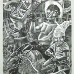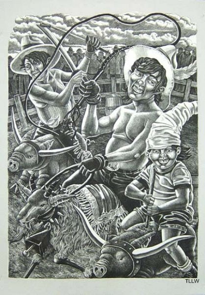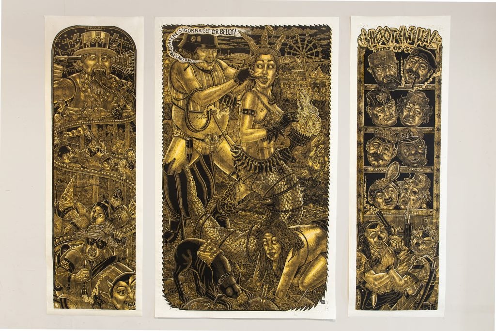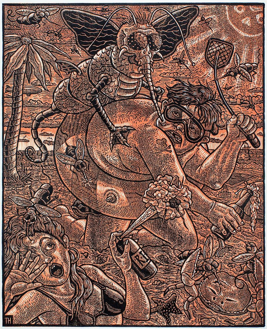 Tom Hück, (born 1971), is an American printmaker best known for his large-scale satirical woodcuts. He lives and works in St. Louis, Missouri, where he runs his own press, Evil Prints. He is a regular contributor to BLAB! of Fantagraphics Books. His work is influenced by Albrecht Dürer, José Guadalupe Posada, R. Crumb, and Honoré Daumier. Huck’s illustrations have appeared in publications such as The Village Voice, The Riverfront Times, and the Minneapolis City Pages.