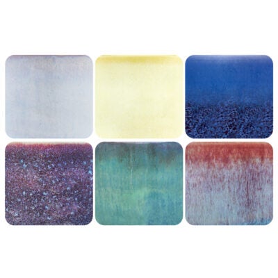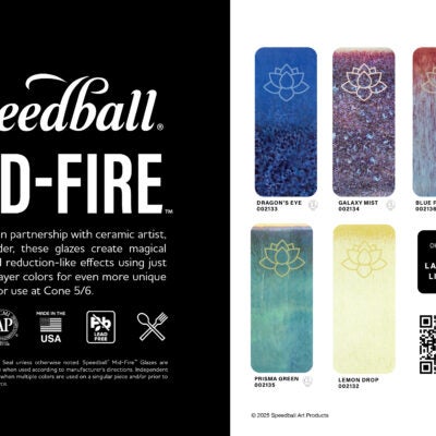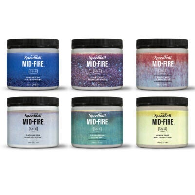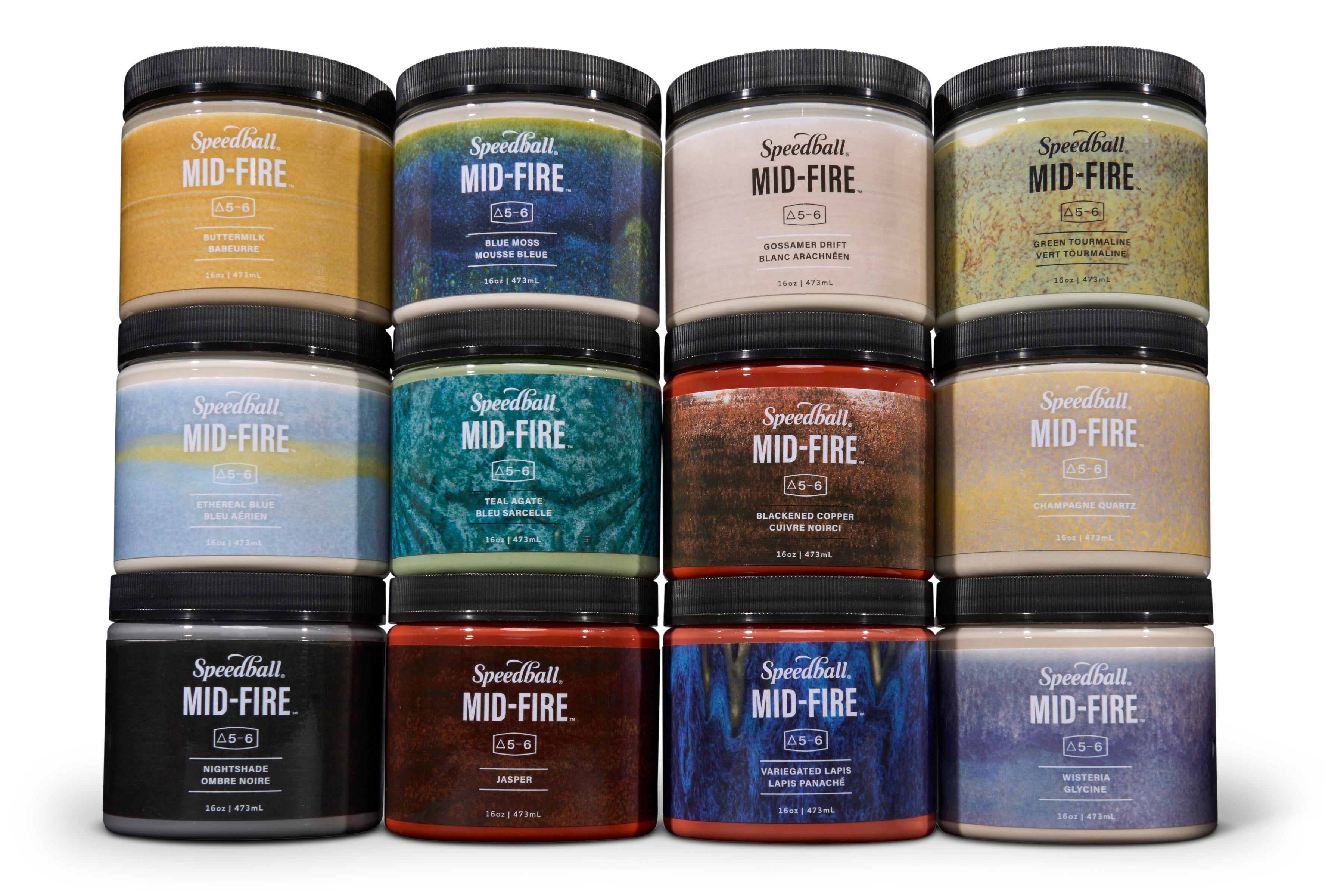 A perfect example of the artist-led philosophies shaping Speedball’s new product innovation, Speedball Mid-Fire Glazes were formulated in partnership with ceramic artist, Nancy Sowder. This exceptional line consists of 36 glazes that create magical mottling and reduction-like effects when fired at Cone 5/6! Create eye-catching results when used individually or layer colors for even more unique variation and dimensionality. Easy to use in application and firing, no matter your experience level! All colors are lead-free and certified dinnerware safe. See color chart for AP/CL certification information. Set includes (1)ea. 16oz size of the following colors: Gossamer Drift, Blackened Copper, Green Tourmaline, Teal Agate, Buttermilk, Jasper, Wisteria, Variegated Lapis, Nightshade, Champagne Quartz, Ethereal Blue, Blue Moss