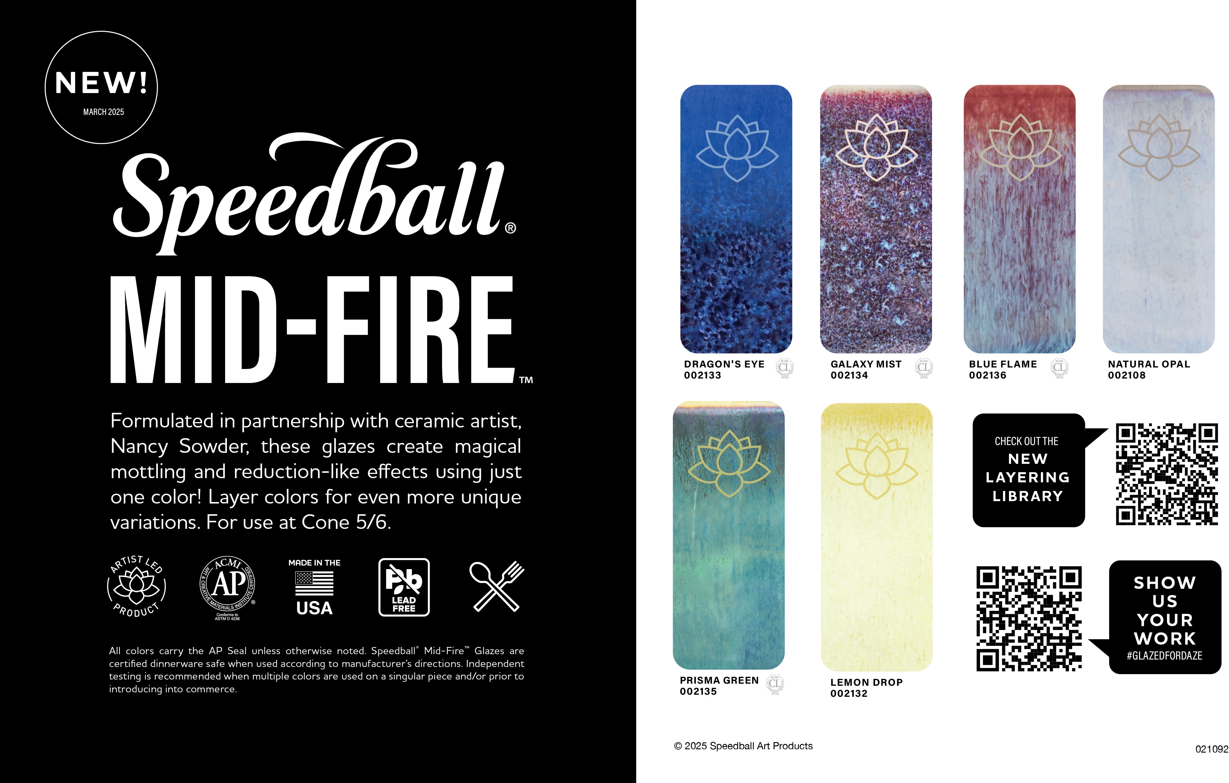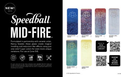 A perfect example of the artist-led philosophies shaping Speedball’s new product innovation, Speedball Mid-Fire Glazes were formulated in partnership with ceramic artist, Nancy Sowder. This exceptional line consists of 36 glazes that create magical mottling and reduction-like effects when fired at Cone 5/6! Create eye-catching results when used individually or layer colors for even more unique variation and dimensionality. Easy to use in application and firing, no matter your experience level! All colors are lead-free and certified dinnerware safe. All colors are AP/CL/ certification information. Chart includes test tiles of 6 new colors: Dragon’s Eye, Galaxy Mist, Lemon Drop, Prisma Green, Natural Opal, Blue Flame.