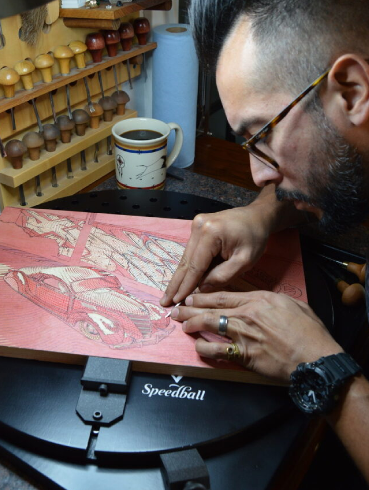With a seamless 360-degree rotation, Spinback allows you to quickly and easily rotate your block to carve in any direction whether using wood or linoleum blocks. Its robust design (22" x 22" x 2.2"), non-slip backing and integrated clamping system guarantee your block won't accidentally shift during carving. This extra stability lets both hands become a part of the carving process, allowing you to dial up the detail and intricacy of your prints, no matter your experience level.